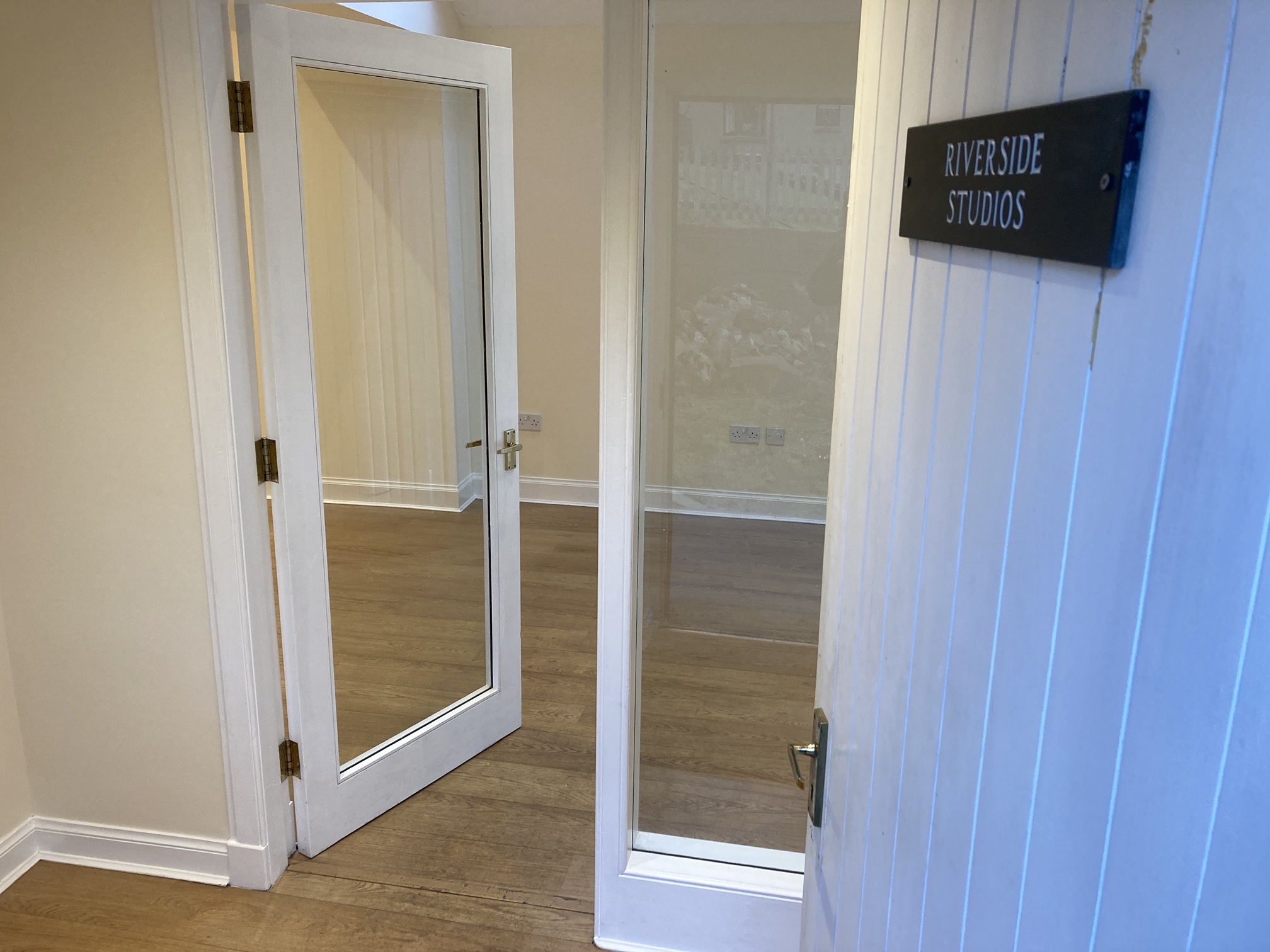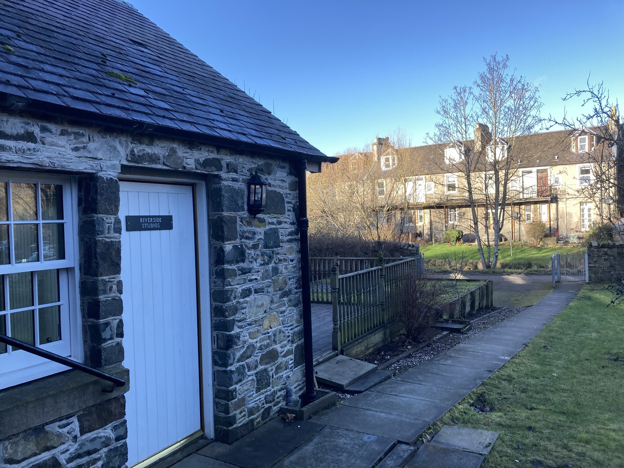 TO LET: A good sized, ground floor, office/studio in excellent condition, in a town centre location, with adjoining small outside decking area and outlook onto the Eddleston Water.