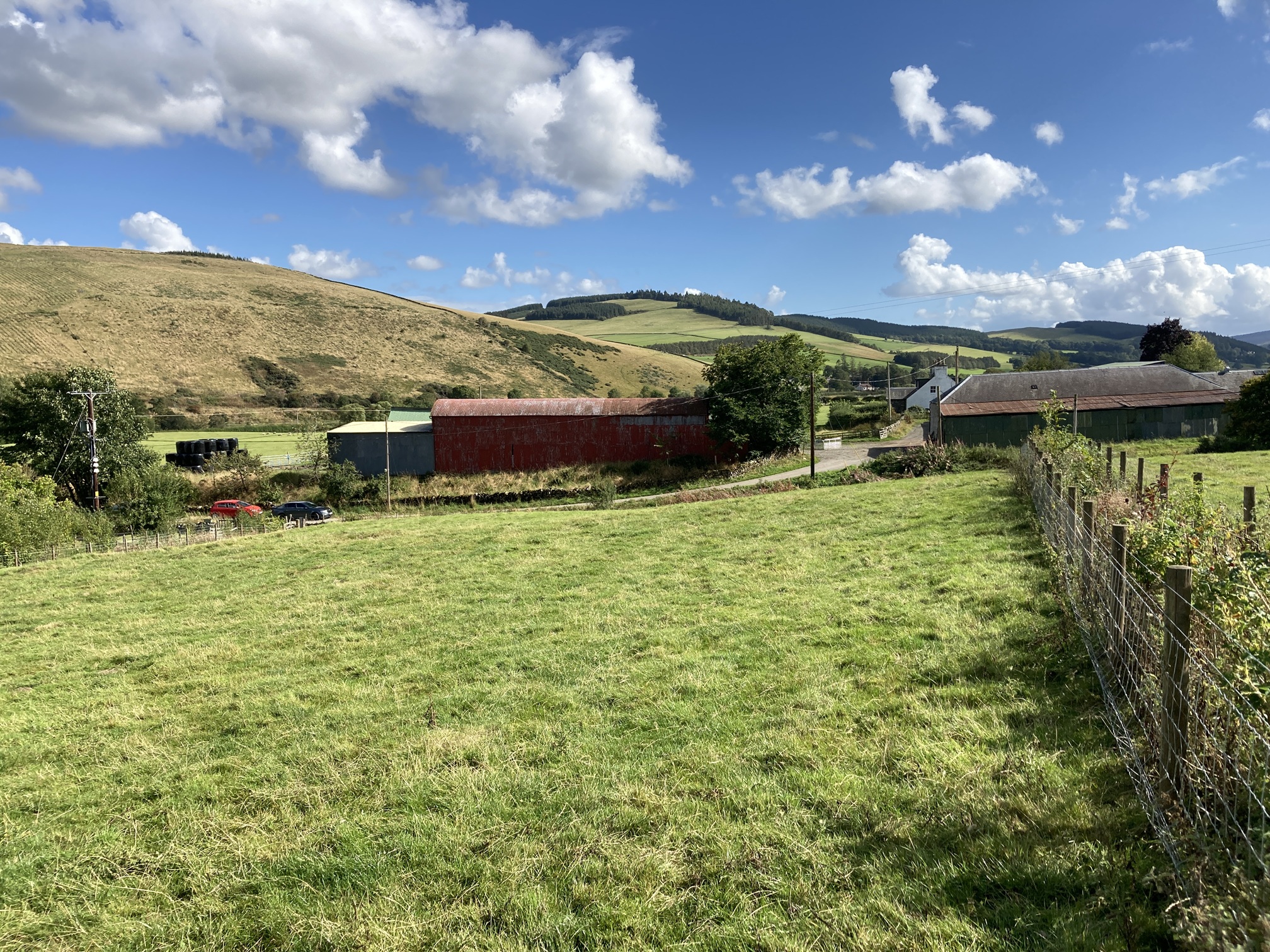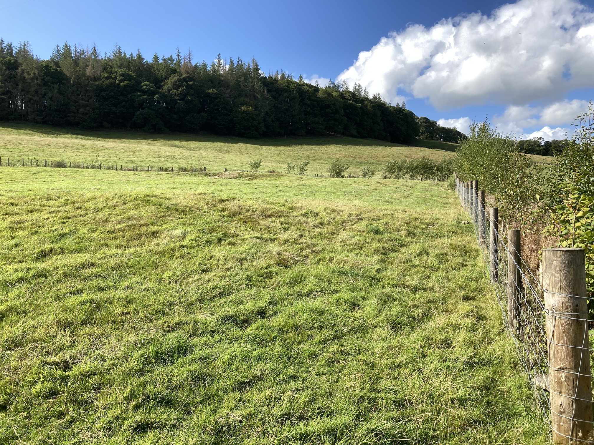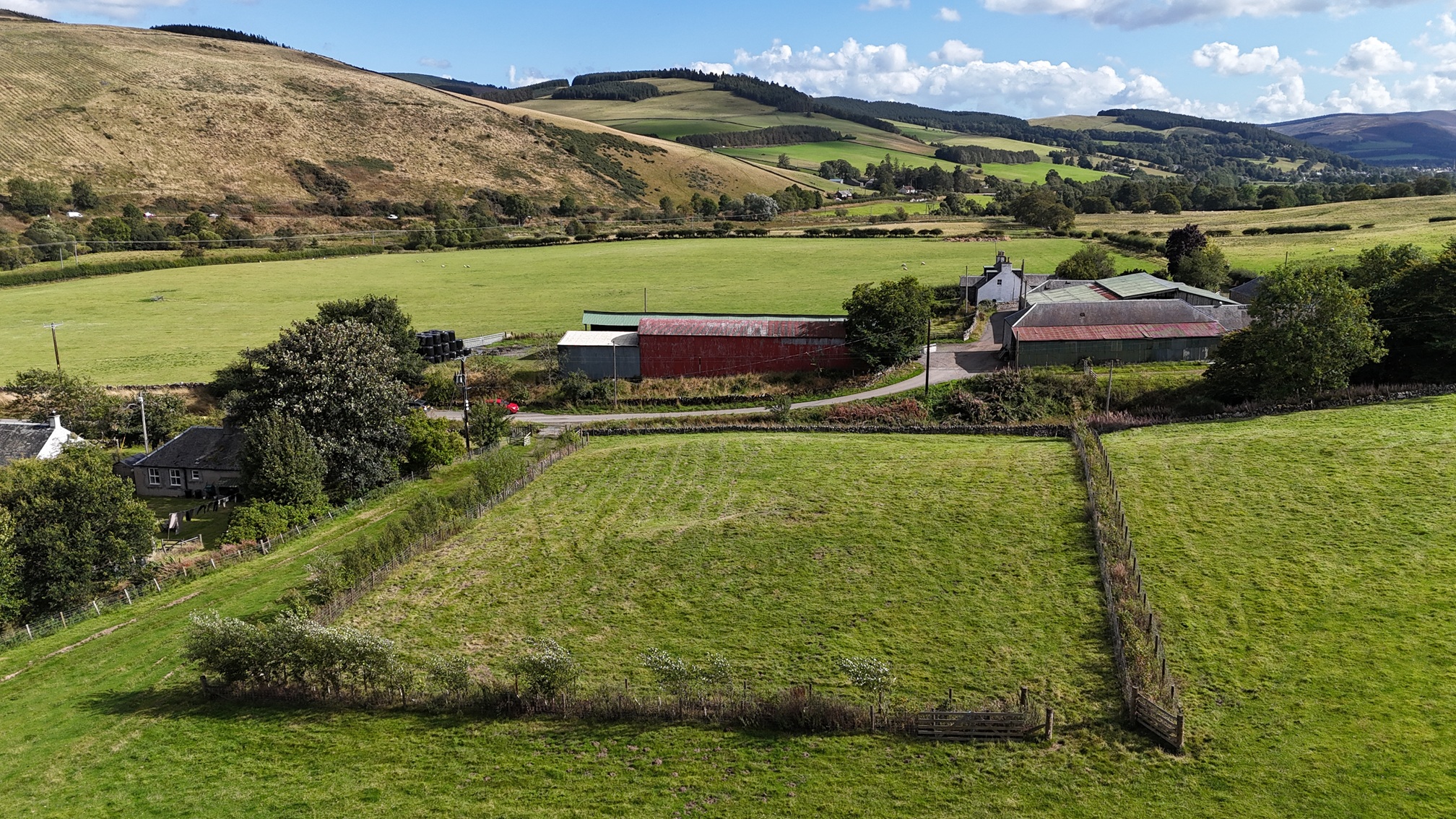 The plot totals approximately 0.27 Ha (0.67 acres) and is currently accessed from the Nether Kidston Farm road by way of a small wooden bridge and field gate. The planning permission requires the construction of a small bridge over the Kidston Burn to solely access to the plot. The plot is clearly delineated by double post and wire fences with mixed species hedging in between along the north, east and west boundaries, with a stone dyke forming the southern boundary.