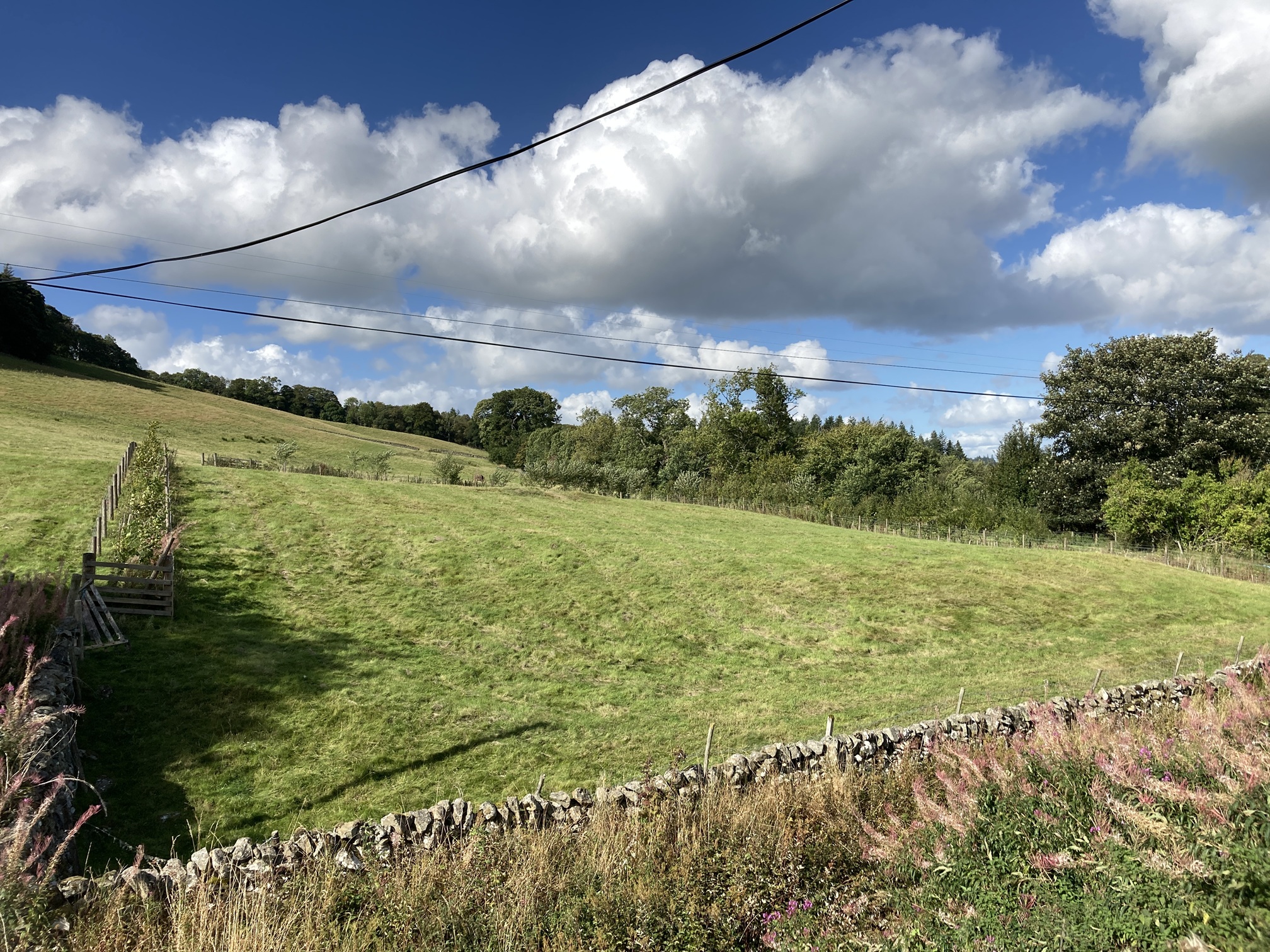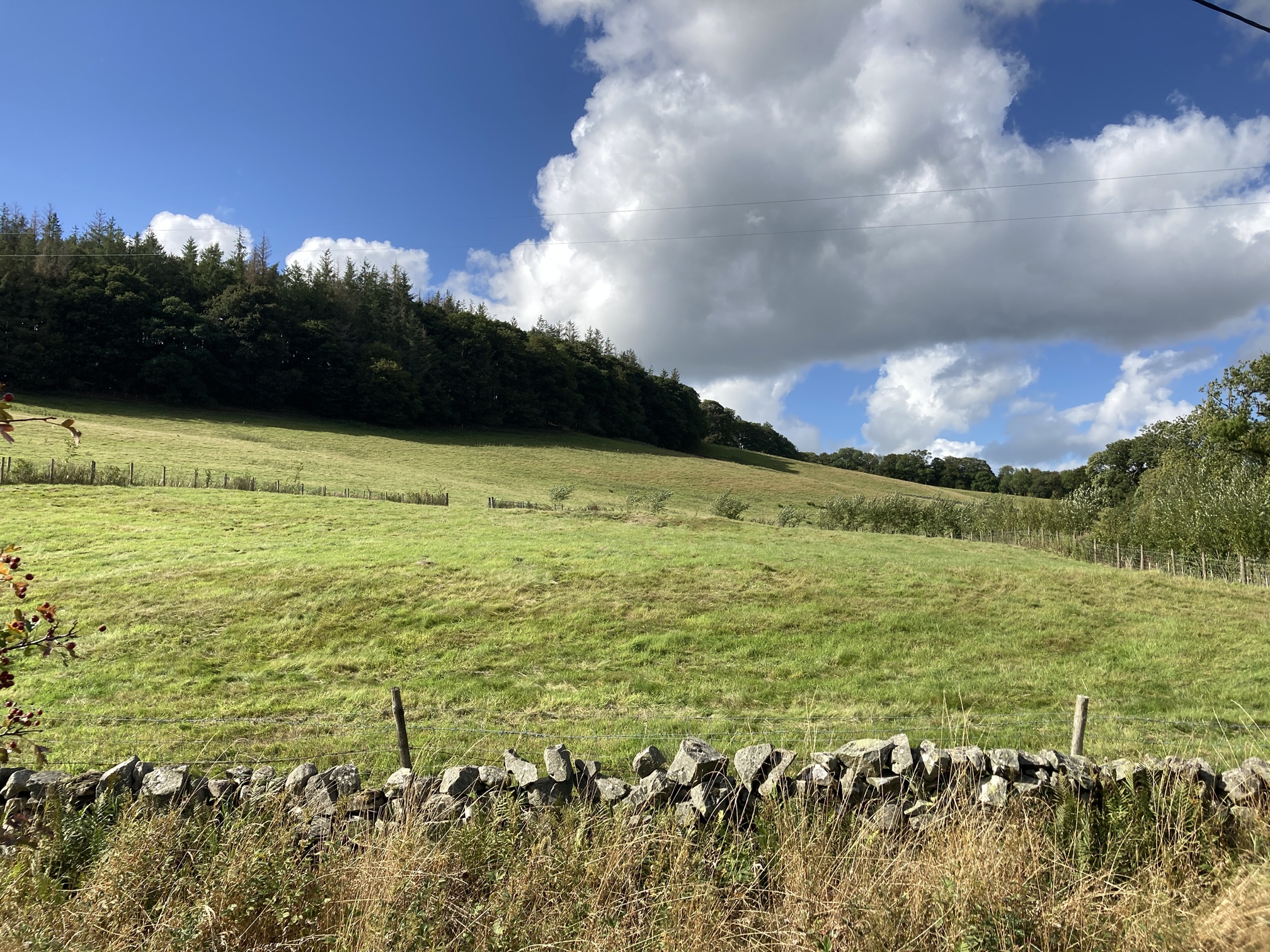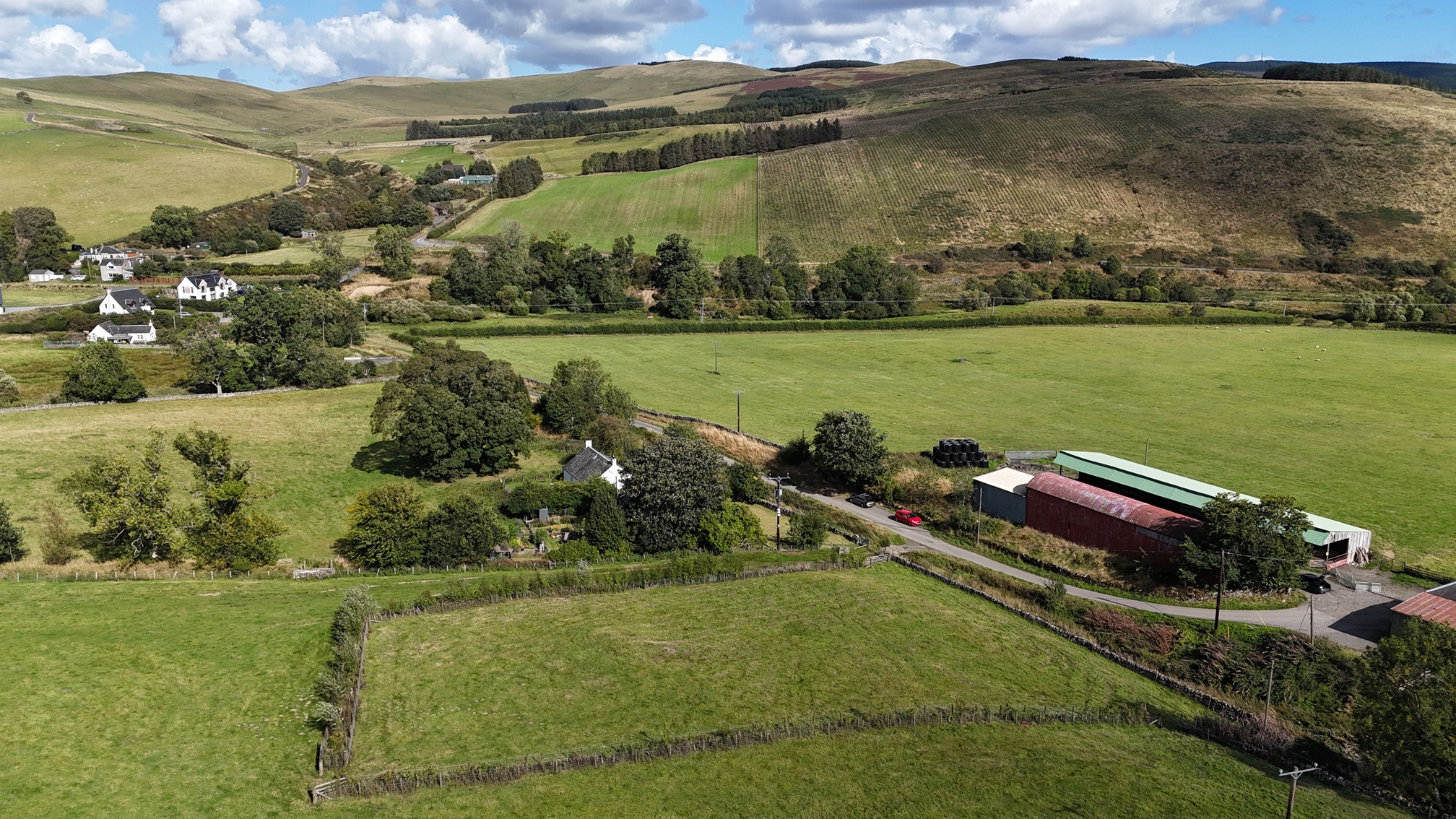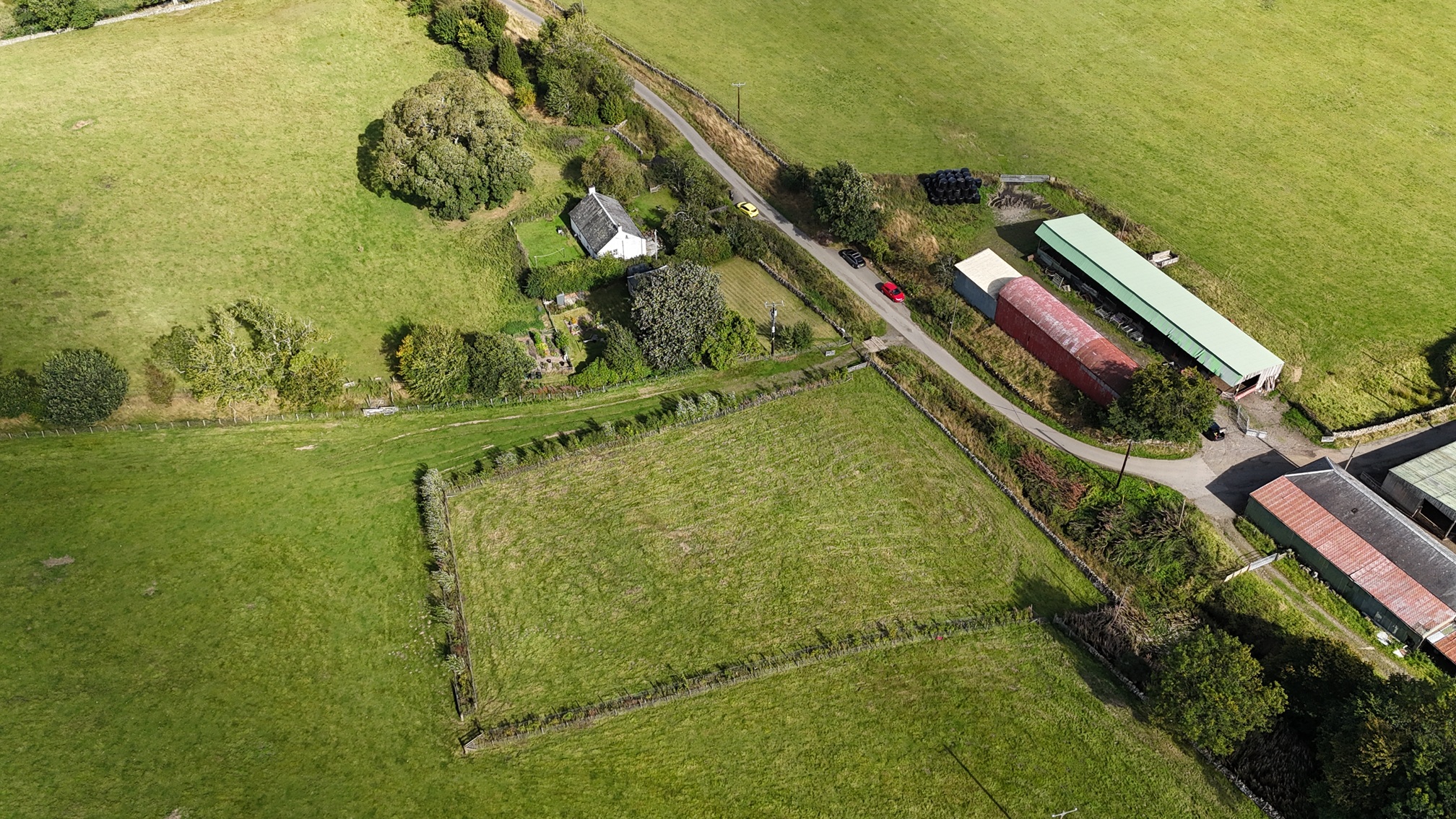 The plot totals approximately 0.27 Ha (0.67 acres) and is currently accessed from the Nether Kidston Farm road by way of a small wooden bridge and field gate. The planning permission requires the construction of a small bridge over the Kidston Burn to solely access to the plot. The plot is clearly delineated by double post and wire fences with mixed species hedging in between along the north, east and west boundaries, with a stone dyke forming the southern boundary.